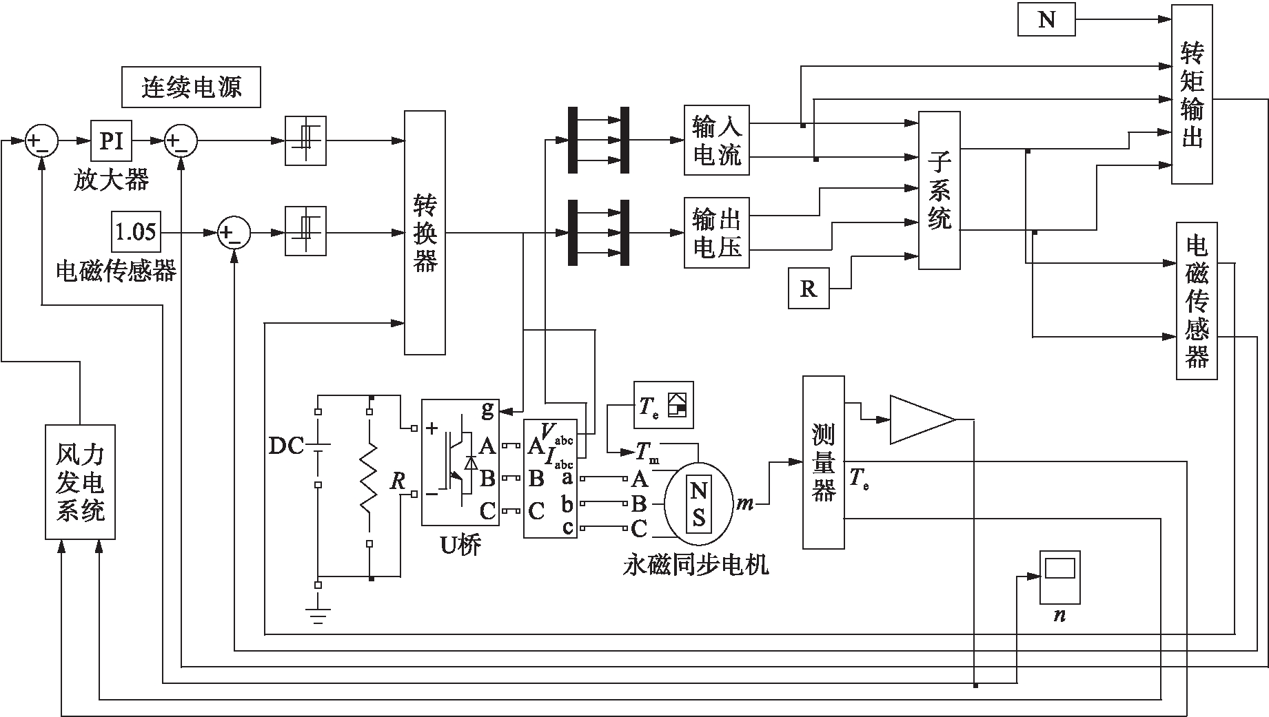 本文使用Matlab软件中的Simulink工具箱搭建仿真模型,并以1.5 MW永磁直驱风力发电机作为研究对象,仿真系统整体结构如图6所示.