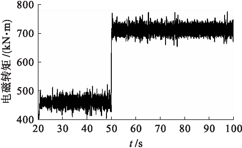 由图7可以看出,电磁转矩脉动比较剧烈,但系统整体的动态响应特性优秀,尤其是在第50 s时,风速发生跳变,电磁转矩能随之变化,从而表明,本文设计的矩阵式变换器能提高系统的动态响应性能.