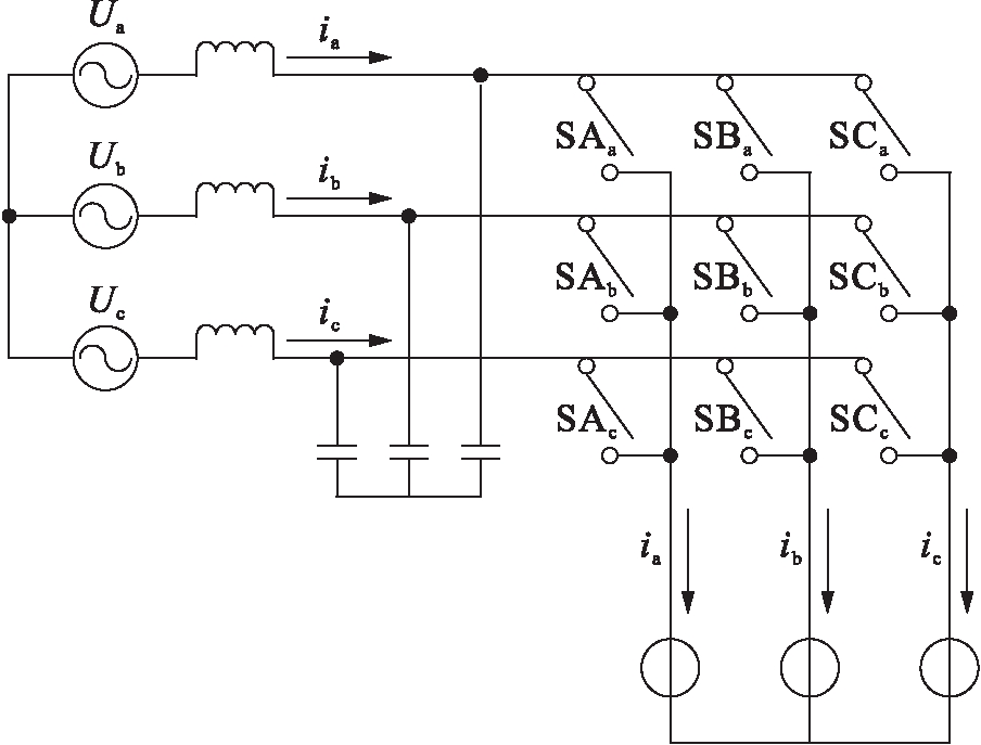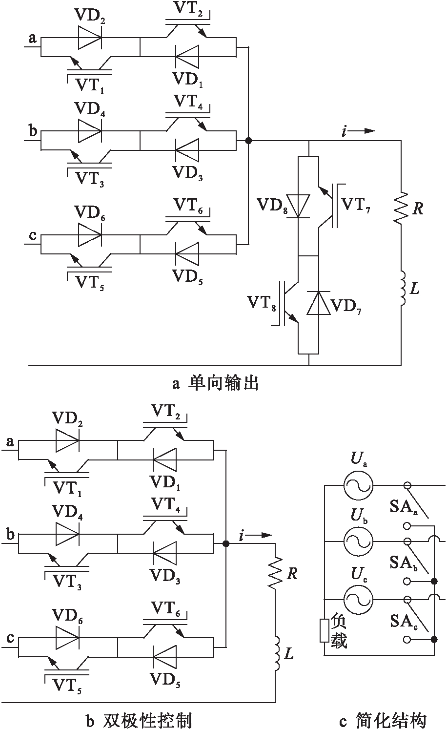将图2b的输入端从单向扩展为三相,可以得到图3所示的三相输入矩阵变换器.图3a为单向输出矩阵变换器,每一相的导通和关断方式与单向输入单向输出时的电路类似.若去掉图3a的续流回路且采用双极性控制策略,可以得到图3b所示的电路结构.电路控制策略为:假设期望输出为正半周期电流,并比较三相电压值的大小,将导通电压值最高线路对应的IGBT管进行斩波,将导通电压值最低的线路对应的IGBT管进行续流.简化图3b结构可得到图3c所示的矩阵变换器,其使用双向可控开关管SAa、SAb和SAc来控制线路的导通与关断,从而得到期望输出频率的交流电.由于实际中使用的是感性负载,因此,这种矩阵式变换器在工作时必须同时对电压最高的一相进行斩波,并将电压值最低的一相进行续流.