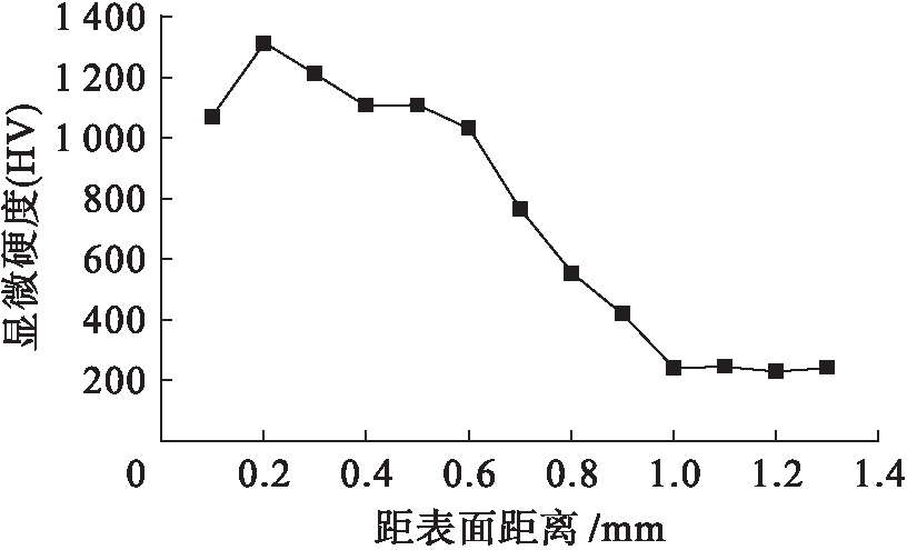 图4为真空熔覆原位自生WxC增强Ni基复合涂层的显微硬度分布曲线.复合涂层平均硬度(1 086 HV)约为基体硬度的4倍.Cr在涂层中的均匀分布使其碳化物Cr7C3在复合涂层中亦呈均匀分布,且与涂层中的WC与W2C一起对Ni基合金涂层产生弥散强化作用.同时大量的WxC与Cr7C3等硬质相的存在,使得结晶过程中发生了优先依附于硬质相表面的异质形核,增加了涂层中的晶核数目,减少了晶核生长所需的溶质含量,抑制了晶核的生长,从而促使晶粒细化,并对复合涂层产生了晶界强化作用.由图4可见,硬度曲线中距涂层表面0.1~0.2 mm处出现了小段硬度上升趋势,随后硬度又缓慢下降,这是因为当熔融状态下的合金粉末内部元素发生扩散时,Cr、Ni、W、Si和Fe等具有较大原子半径的大密度原子在重力作用下向下扩散,但因为其扩散能力较弱,在涂层完全凝固之前只能进行短距离扩散,从而聚集在涂层中部,因此,涂层表面附近WC等硬质相含量较低.熔覆过程中元素的烧损和挥发导致表面硬质相含量进一步减少,随着距表面距离的增加,涂层中硬质相的含量增加,涂层硬度随之增大.基体中的Fe元素及复合涂层中的合金元素的相互扩散使得复合涂层中Cr、Ni、W等元素的相对含量降低,导致这些元素对复合涂层的固溶强化作用减弱,硬度降低,且越靠近基体涂层受Fe元素稀释影响越大,因此,复合涂层硬度呈先增大再减小的趋势.基体材料受元素扩散的影响,其靠近界面处的扩散层显微硬度会有所提高,且其硬度随与界面距离的增大而减小,这种硬度逐渐降低的扩散层可以在复合涂层与基体之间产生过渡作用,从而对复合涂层受到的冲击产生缓冲效果.