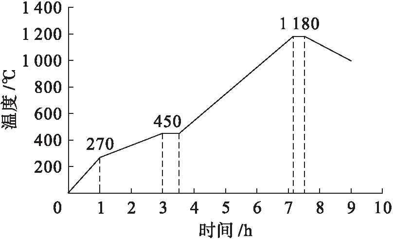 将合金粉末放入小型试罐中,以5∶1的质量比加入自制粘结剂并均匀搅拌.为了去除粉末膏剂中残留的空气与水分,对混合粉末膏剂进行抽真空处理.然后将处理后的粉末膏剂涂在经过喷砂处理后的基体表面,预制涂层厚度约为2 mm.将涂好膏剂的试样放入烘箱中烘干,烘干温度为80 ℃,烘干时间约为3 h.将烘干后的试样放到真空炉中进行真空熔覆处理,得到的加热温度曲线如图1所示.在具体试验过程中,0~1 h内升温到270 ℃,1~3 h内以90 ℃/h的升温速度加热至450 ℃并保温0.5 h,之后再以200 ℃/h的升温速度继续升温.这种升温方式可以保证预制涂层中的水分可以完全去除[14].当温度达到1 180 ℃后保温20 min,使得涂层内外温度均匀,涂层与基体内元素得到充分扩散.保温后随炉自然降温,当温度低于400 ℃时,关闭真空阀,当温度低于100 ℃时,从炉中取出试样并进行空冷.