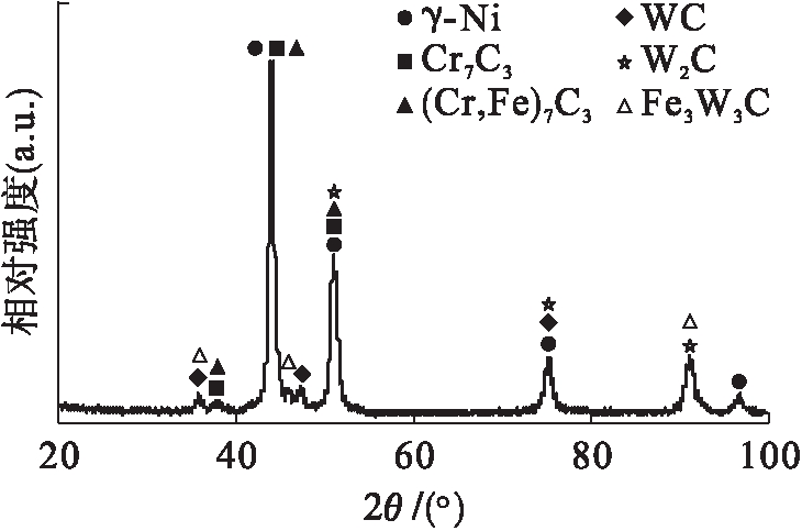 图3为真空熔覆原位自生WxC增强Ni基复合涂层的XRD图谱.由图3可知,复合涂层主要由γ-Ni、Cr7C3、(Cr,Fe)7C3、W2C、WC和Fe3W3C组成.结合图2和EDS扫描结果可知,白色块状组织为WxC相,且该相周围的灰色组织为(Cr,Fe)7C3和WxC共存的多相组织.