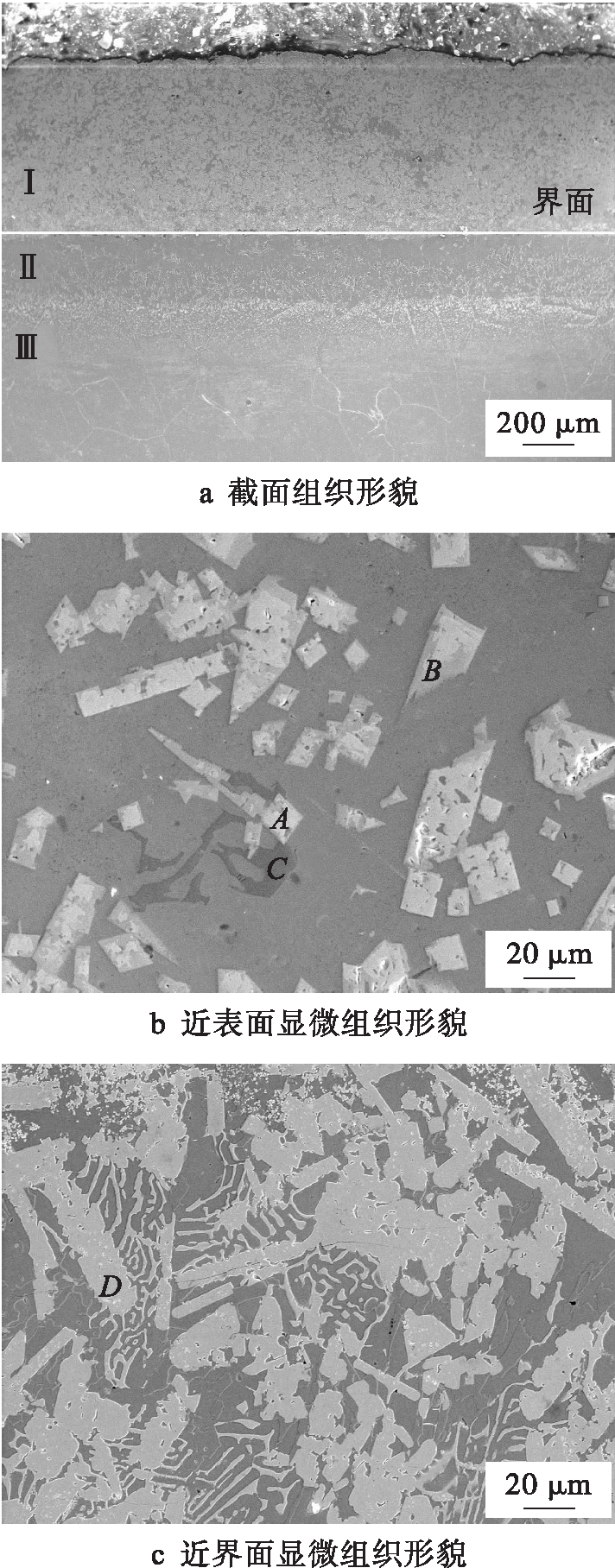 经过真空熔覆后的试样经线切割、镶嵌、打磨和抛光之后,利用金相显微镜及日立S-3400N型扫描电子显微镜(SEM)观察样品截面的组织形貌,并利用SEM自带的能谱分析仪(EDS)分析样品的微观结构和化学成分.采用XRD7000型X射线衍射仪对复合涂层进行相结构分析,具体试验中选用Cu靶,电压为40 kV,电流为30 mA,扫描速度为4°/min,扫描区间为20°~100°.采用HVS-1000型数显显微硬度计测量复合涂层的显微硬度,施加载荷为200 g,加载时间为10 s.采用MMU-5G型材料端面高温摩擦磨损试验机对复合涂层的摩擦磨损性能进行测试,试验形式为销盘磨损.下摩擦副选用Colmonoy88合金粉末等离子堆焊层圆盘,尺寸为φ 43 mm×3 mm.上摩擦副分别为Colmonoy88合金粉末真空熔覆层试样和316L不锈钢销棒,尺寸为φ 4 mm×15 mm.法向载荷为150 N,磨盘转速为150 r/min,磨损时间为20 min,磨痕直径为21 mm,磨损行程为200 m.利用扫描电子显微镜分析磨损后试样的磨痕形貌和磨损机制.