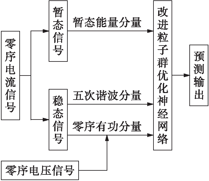 使用上文提出的改进PSO-BP算法处理配电网故障选线的问题,其原理框图如图2所示.首先,获取配电网各条线路的零序电压和电流信号;然后,分别计算、提取电压和电流信号的暂态特征与稳态特征,并构造训练集、测试集;最后,使用训练集训练改进粒子群的神经网络算法模型,并使用测试集得到选线结果.