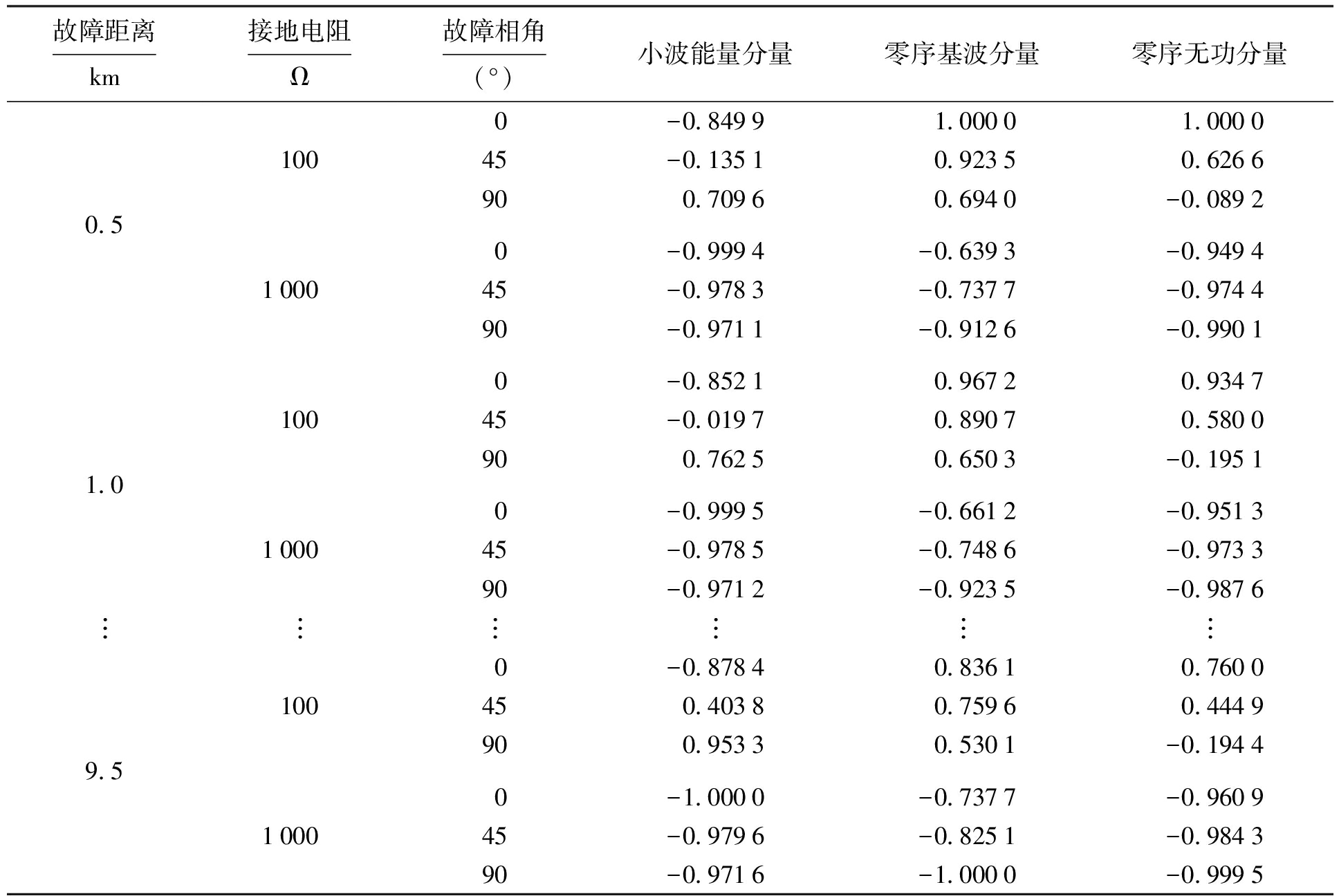 故障距离km接地电阻Ω故障相角(°)小波能量分量零序基波分量零序无功分量0.51.0︙9.510010001001000︙10010000-0.8499 1.0000 1.000045-0.13510.92350.6266900.70960.6940-0.08920-0.9994-0.6393-0.949445-0.9783-0.7377-0.974490-0.9711-0.9126-0.99010-0.85210.96720.934745-0.01970.89070.5800900.76250.6503-0.19510-0.9995-0.6612-0.951345-0.9785-0.7486-0.973390-0.9712-0.9235-0.9876︙︙︙︙0-0.87840.83610.7600450.40380.75960.4449900.95330.5301-0.19440-1.0000-0.7377-0.960945-0.9796-0.8251-0.984390-0.9716-1.0000-0.9995