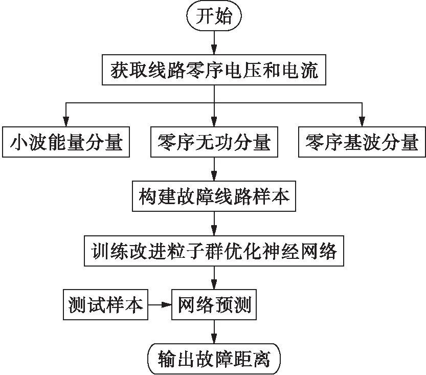 使用改进粒子群神经网络算法解决配电网故障测距问题,其流程如图3所示.使用小波变换和傅里叶变换提取零序电压与电流的无功分量、基波分量以及小波能量分量构建特征向量,并训练改进粒子群的神经网络算法模型,再利用测试得到选线结果.
