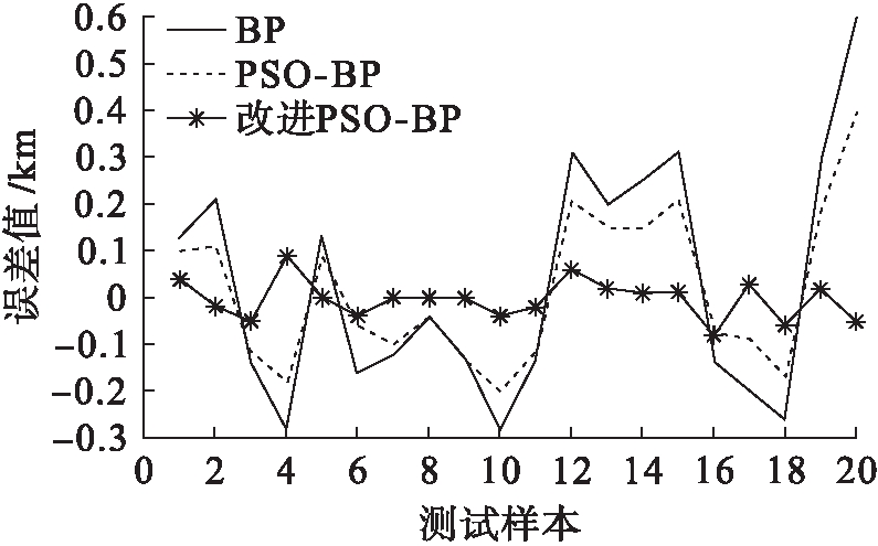 使用原BP算法、PSO-BP算法和改进PSO-BP算法得到各测试样本的测距误差值如图5所示.从图5可以看出,相对于传统算法,改进粒子群优化的神经网络算法具有更精确的测距结果及更小的误差.由此表明,该算法受相位角和接地误差的影响更小,具有一定的鲁棒性.