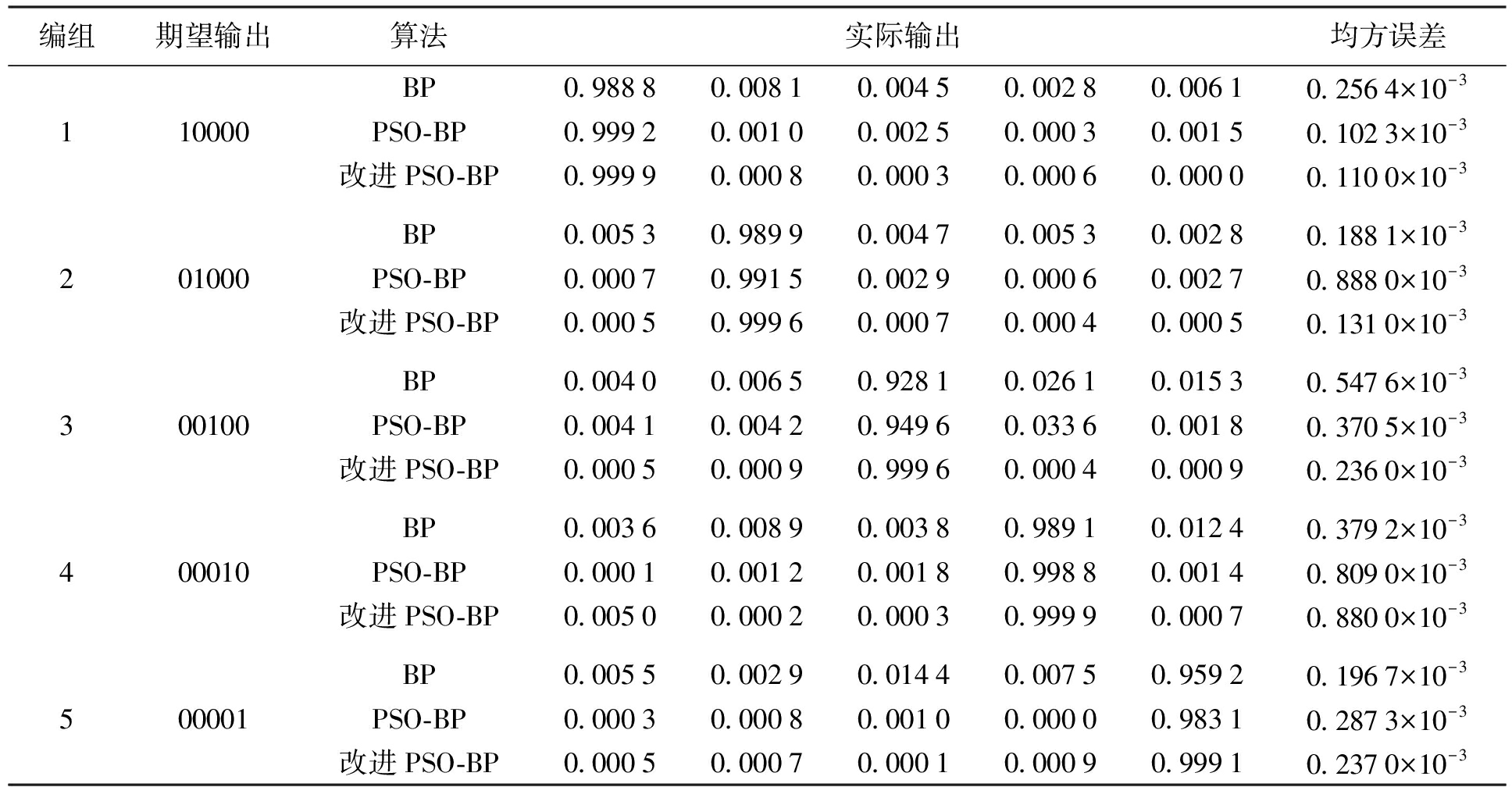编组期望输出算法实际输出均方误差110000201000300100400010500001BP0.98880.00810.00450.00280.00610.2564×10-3PSO-BP0.99920.00100.00250.00030.00150.1023×10-3改进PSO-BP0.99990.00080.00030.00060.00000.1100×10-3BP0.00530.98990.00470.00530.00280.1881×10-3PSO-BP0.00070.99150.00290.00060.00270.8880×10-3改进PSO-BP0.00050.99960.00070.00040.00050.1310×10-3BP0.00400.00650.92810.02610.01530.5476×10-3PSO-BP0.00410.00420.94960.03360.00180.3705×10-3改进PSO-BP0.00050.00090.99960.00040.00090.2360×10-3BP0.00360.00890.00380.98910.01240.3792×10-3PSO-BP0.00010.00120.00180.99880.00140.8090×10-3改进PSO-BP0.00500.00020.00030.99990.00070.8800×10-3BP0.00550.00290.01440.00750.95920.1967×10-3PSO-BP0.00030.00080.00100.00000.98310.2873×10-3改进PSO-BP0.00050.00070.00010.00090.99910.2370×10-3