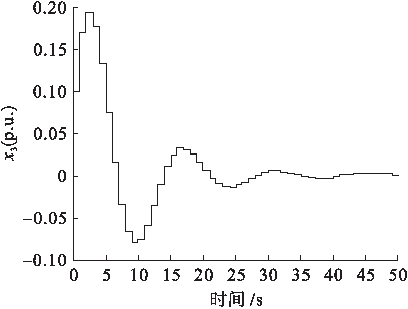 取并网风机的网络化控制系统的初始状态为(x1,x2,x3)T=(0.3,0.2,0.1)T,测试具有网络时延的并网可控制效果,结果如图2~5所示.由图2~4可以看出,网络控制系统的状态在偏离当前运行状态后,虽各变量的响应曲线各不相同,但经过一段时间的振荡后均将逐渐趋于稳定状态.由图5可以看出,并网风机的输出在偏离当前运行状态后,经过一段时间的振荡也将逐渐趋于稳定状态.图6为无网络时延时系统的输出响应曲线.由图6可以看出,y在本文控制策略的作用下能快速首先到达平衡点.对比图5、6的结果可知,本文设计的控制策略具有鲁棒性,且能处理有网络时延的网络化控制系统的控制问题,满足了现代电网对风机运行与调节模式的要求.