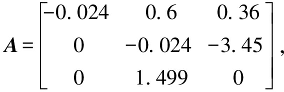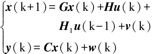 式中:v(t)、w(t)为互不相关的均值为零的白噪声;x(t)为控制目标;u(t)为单位阶跃函数;A、B、C为系统矩阵.对式(1)的一个采样周期T进行积分,可得离散状态空间模型,即
