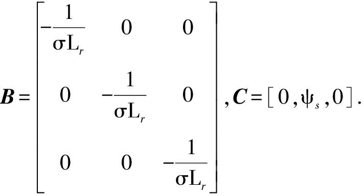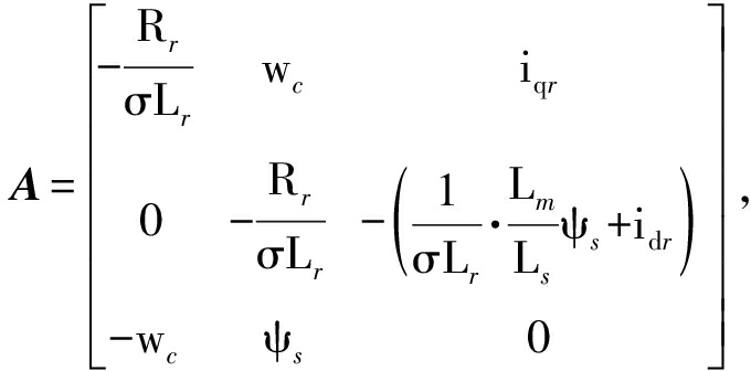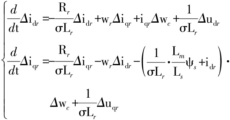 式中:udr、idr分别为d轴定子电压和电流;uqr、iqr分别为q轴定子电压和电流;Rr为定子电阻;wc为电角速度;wr为机械角速度;σ为漏感常数;ψs为永磁体的磁链;Lm和Ls分别为转子与定子绕组自感;Lr为等效转子绕组自感.可以得到有小信号扰动时的并网风机的连续模型,即