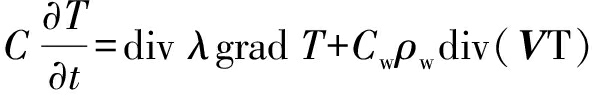 式中:T为瞬态温度;t为过程进行的时间;λ为导热系数;ρw为水的容重;V为流体的相对速度矢量;C为热容量;Cs、Cw、Ci、Ca分别为土颗粒热容量、水热容量、冰热容量及空气热容量;θs、θw、θi、θa分别为体积土颗粒含量、体积含水量、体积含冰量及体积空气含量;λs、λw、λi、λa分别为土的导热系数、水的导热系数、冰的导热系数及空气的导热系数.