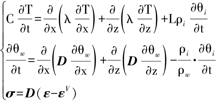 冻土地区由于温度的改变引起冰水相变,温度场和水分场改变会引起应力场改变.假定土体为均质各项同性,土颗粒和冰、水为不可压缩线弹性变形体,土体基本应力应变方程为