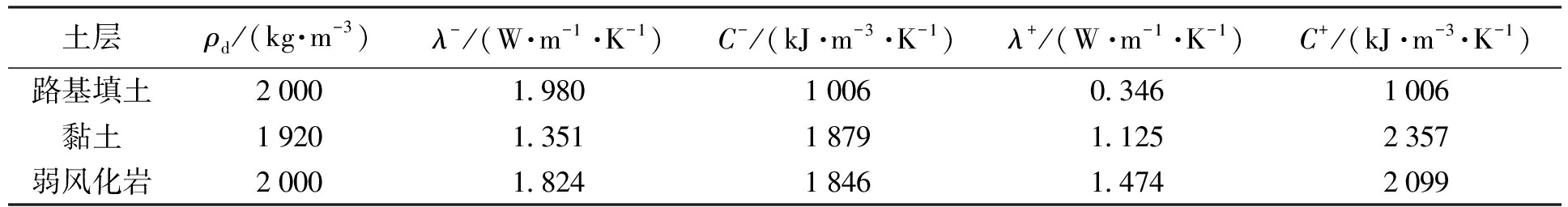 土层ρd/(kg·m-3)λ-/(W·m-1·K-1)C-/(kJ·m-3·K-1)λ+/(W·m-1·K-1)C+/(kJ·m-3·K-1)路基填土20001.98010060.3461006黏土19201.35118791.1252357弱风化岩20001.82418461.4742099
