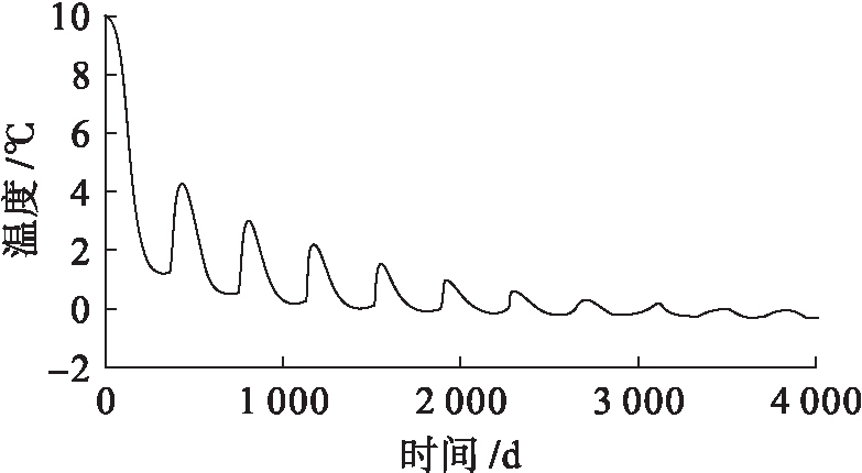 图2为1 m深度处温度变化.取深度1 m土温度变化为研究对象,可知在冬季(冻融循环过程)出现温度变化放缓区,随着冻融循环过程不断重复,这一区域的温度场趋于一个稳定值,温度变化不再明显.