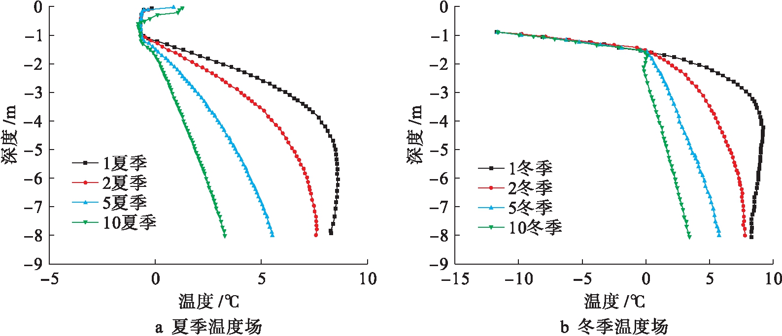 图1为第1,2,5,10年冬夏温度场分布.根据土层温度分布可知,地表温度随气温迅速降低,由于热传导效应使得浅层土温度剧烈变化,达到一定深度后变化幅度明显减小,原因在于深层土热量补给充分.可以发现在约0 ℃区域相变剧烈,由于耦合作用使得温度传导过程明显减慢,体现于温度场斜率达到0 ℃后明显降低并趋于0.对比第2年、第5年、第10年结果可知,1.0 m深度土层处于相变剧烈区,经过多年冻融循环后趋于一个稳定状态,尤其在第10年出现近1.0 m恒温区,阻碍温度向更深处土层传导.