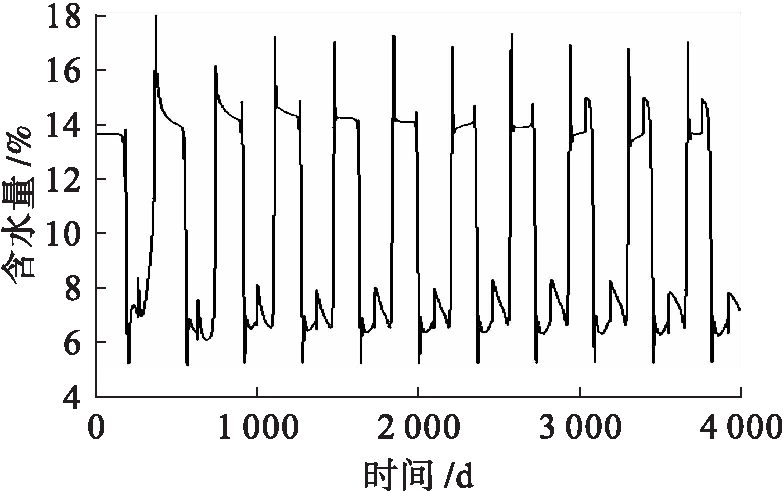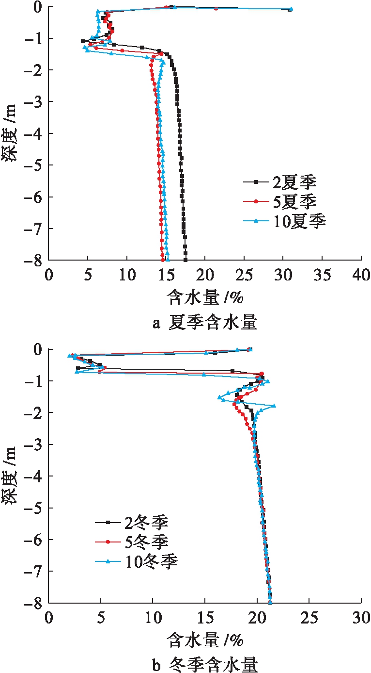 图3为第2,5,10年冬夏含水量分布.根据水分场分布可知,土层中水分在一定深度处急剧变化,这一深度与温度场所反应出的相变剧烈区相对应,随着冻融循环过程的往复,这一聚变区不断加深并扩张[10].表层土得到补给,含水量变化明显,深层土与温度场相似,达到一定深度区域稳定值后,并不会因表层或相变引起水分波动而变化.