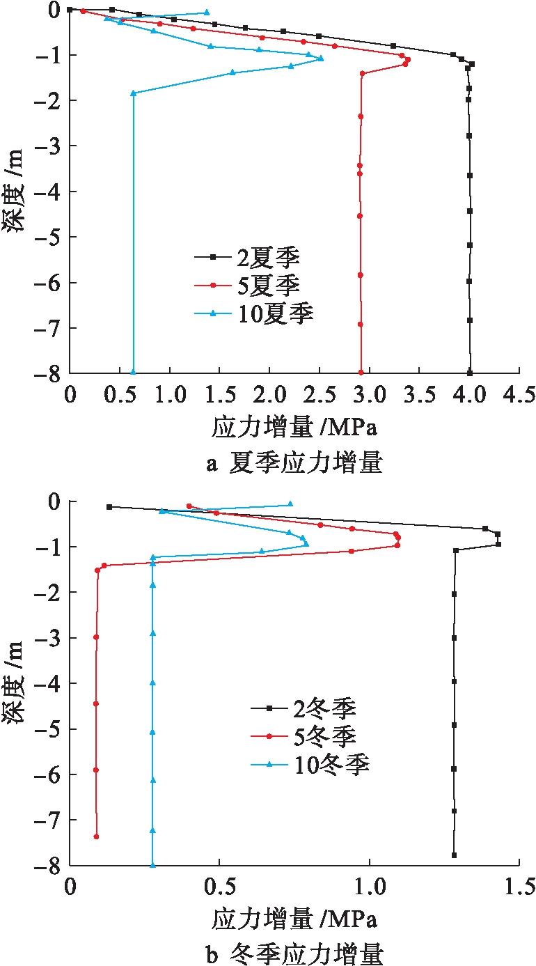 图6为第2,5,10年冬夏应力增量场.对比应力增量可知,土层冻结区域出现一个峰值,由于土层中多场耦合及温度变化引起相变和水分场变化,通过冻结力与应力场产生耦合作用,造成了冻结区的应力峰值.随着多年冻融循环,应力增量仅表现在冻结区,对深处土层影响减弱,与温度场和水分场变化协调,符合工程实际.