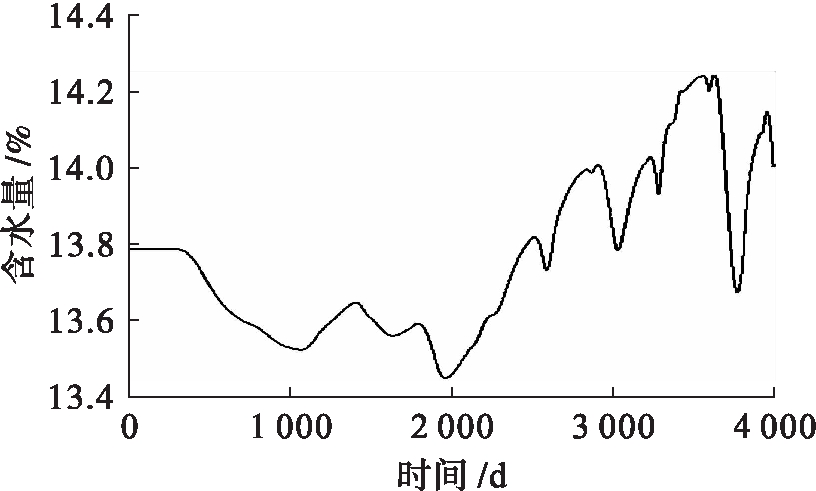 图4、5为1、2 m深度处含水量变化.对比1、2 m深度土层水分场可知,1 m深度水分场呈现明显的周期性特点,当超过2 m后周期性特点明显降低,耦合作用效果降低,水分场波动多来源于水分补给或土层因素.