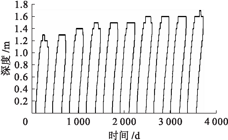 通过上述计算可以得到土层的位移和冻结深度变化,如图7、8所示.随着冻结次数增加,冻结深度有所增加,在达到第六次冻结后冻结深度不再发生变化,即冻结循环过程趋于稳定.在本次计算中,最大冻结深度可达到1.8 m.
