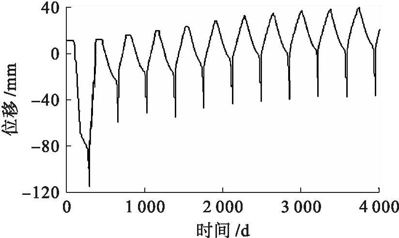 由图7可知,正值表示地基表面升高,负值表示低于初始值,初始状态为第一年冬天.随着温度降低,土体冻结导致体积膨胀,地基表层出现隆起.随着固相冰向液相转化,土体表面下沉,即融沉效应,同时浅层土体融化的液相水会导致局部水分增加,减弱土体有效应力,加剧融沉,因此,土体下沉常表现为短时间急剧下降.随着时间增加,冻融循环作用往复,形成较为稳定的冻结带,融沉深度趋于稳定.由于冻结深度缓慢加深,冻胀作用随之不断增加,长期来看对于道路工程是一种危害.