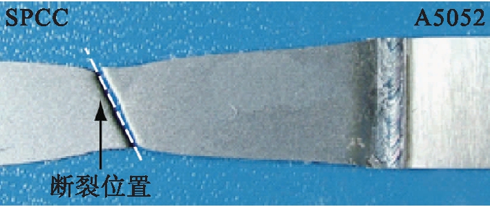 通过拉伸剪切试验获得的焊接速度与热输入量之间的关系如图11所示.在最佳工艺参数区域内拉伸剪切试样均断裂在SPCC低碳钢板母材侧,且最佳热输入量范围为375~800 J/cm.当热输入量超过800 J/cm时,由于热输入量过大,使得SPCC低碳钢板过多熔化,金属间化合物层厚度过厚,导致拉伸剪切强度下降甚至造成无法接合.当焊接热输入量小于375 J/cm时,由于热输入量不足,热量无法通过SPCC钢传导至A5052铝合金,从而导致搭接接头未熔合或熔合不良.