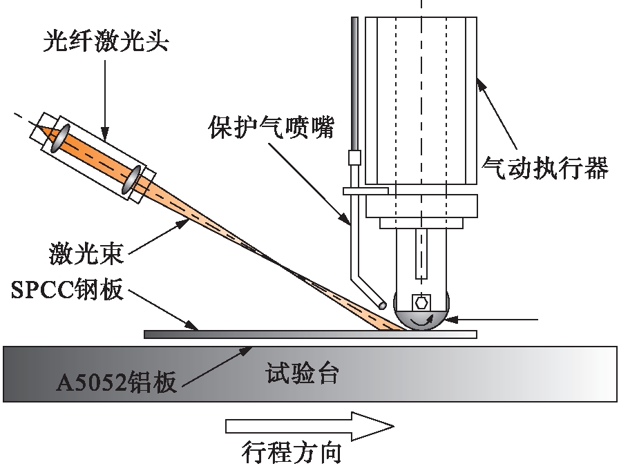 光纤激光器额定输出功率为2 kW、波长均值约为1.07 μm、传输光纤芯径为100 μm,操作光纤芯径为150 μm,准直镜焦距为100 mm,聚焦镜焦距为400 mm.激光束能量呈非高斯分布形态,其焦点直径约为0.29 mm.激光焊接加工头安装在六轴焊接机器人的第六臂上,激光束从前方以60°入射角照射,XY工作台的Y轴由伺服电机驱动.