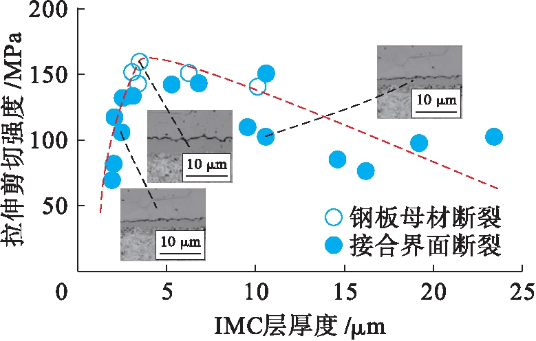 图12 IMC层厚度对焊接接头拉伸剪切强度的影响