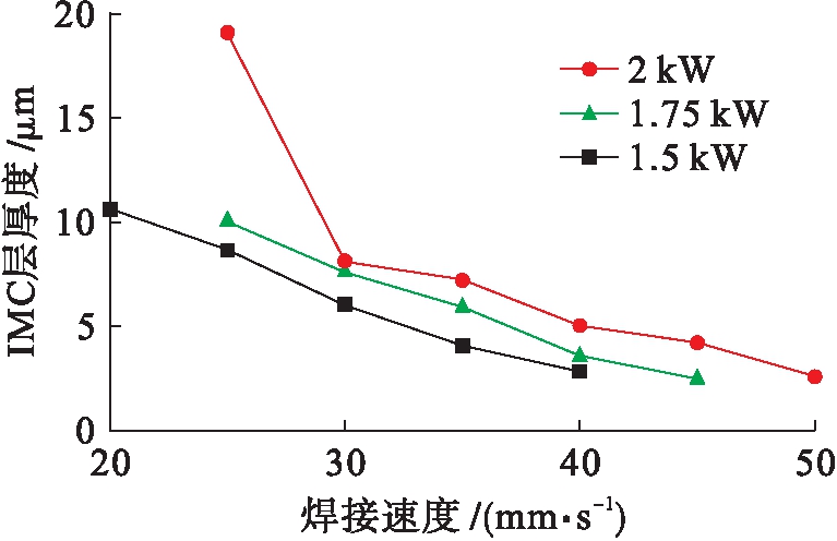 图5 激光功率与焊接速度对焊接接头IMC层厚度的影响