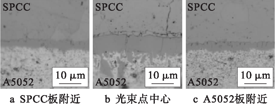 激光束照射在两板搭接部分的中心位置,光斑中心位置及两侧的显微组织如图4所示,相关焊接参数与图3相同.由图4可知,在搭接接头接合面处形成了金属间化合物.经测量金属间化合物层厚度后发现,SPCC低碳钢端头侧约为3.7 μm,焊缝中心处约为8.1 μm,A5052铝合金端头侧约为4.2 μm,由此可知,焊缝中心处金属间化合物层最厚.这是由于试验所用光纤激光器的光斑能量分布虽然类似平顶型,但与焊缝边缘金属相比,由于焊缝中心位置的金属散热条件较差,热量易集聚,导致加热温度较高,冷却速度较慢,使得金属间化合物具有较长时间生长.