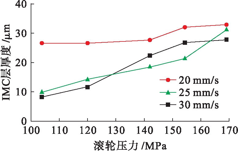 图7 滚轮压力与焊接速度对焊接接头IMC层厚度的影响
