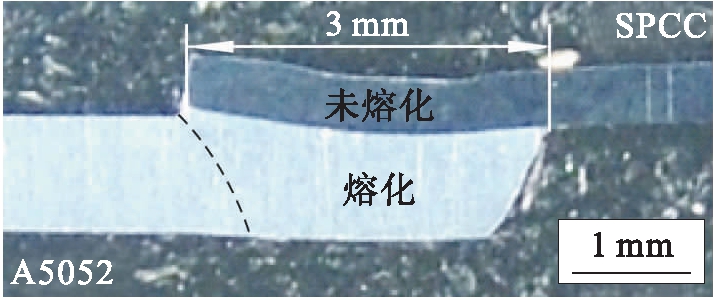 试验材料为SPCC低碳钢和A5052铝合金,SPCC板尺寸为200 mm×40 mm×0.5 mm,抗拉强度为168 MPa,化学成分为w(C)=0.04%,w(Mn)=0.19%,w(S)=0.001 3%,w(P)=0.013%,余量为Fe.A5052铝合金尺寸为200 mm×40 mm×1 mm,抗拉强度为260 MPa,化学成分为w(Si)=0.09%,w(Fe)=0.27%,w(Cu)=0.02%,w(Mn)=0.01%,w(Mg)=2.48%,w(Cr)=0.21%,w(Ti)=0.01%,余量为Al.在焊接过程中SPCC低碳钢板在上、A5052铝合金板在下,搭接接头的搭接宽度为3 mm,搭接间隙为0 mm.为了加快焊接区的冷却速度,试验台面采用紫铜材料,激光照射面(低碳钢板表面)涂覆激光吸收涂料.为了防止焊接过程中发生氧化,在接合面的铝板侧涂覆粒度为15~21 μm的KAlF4·K2AlF5·H2O铝钎剂,从而增加熔化金属的润湿性.