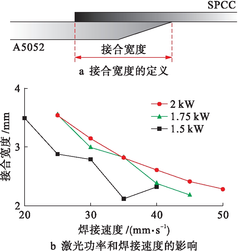 接合宽度定义示意图如图6a所示.当激光输出功率为1.5~2 kW,焊接速度为20~50 mm/s,滚轮压力为150 MPa,其他参数如表1所示时,接合宽度的变化规律如图6b所示.由图6b可知,当焊接速度一定时,随着激光输出功率的降低,接合宽度随之缩短.当焊接速度为25 mm/s,激光功率由2 kW降至1.5 kW时,接合宽度由3.5 mm缩短至2.9 mm.此外,当激光功率一定时,随着焊接速度的增加,接合宽度随之缩短.当激光功率为2 kW,焊接速度由25 mm/s增加至35 mm/s时,接合宽度由3.5 mm缩短至2.8 mm.这是由于随着激光功率的降低和焊接速度的加快,都会使得焊接热输入量降低,导致焊接接头接合宽度变小.