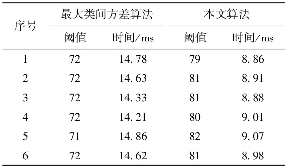 序号最大类间方差算法阈值时间/ms本文算法阈值时间/ms17214.78798.8627214.63818.9137214.33818.8847214.21809.0157114.86829.0767214.62818.98