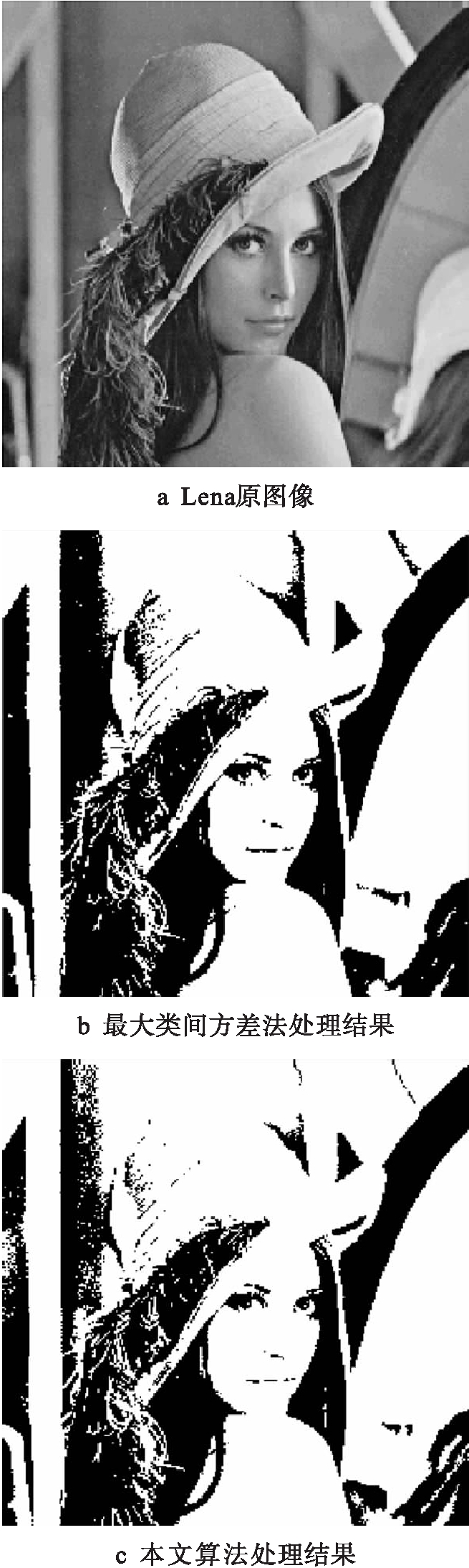 为了衡量本文算法的处理效果,分别采用本文算法和传统的最大类间方差图像分割算法对Lena图像进行处理,处理结果如图2所示.其中图2a为原图像,图2b为传统的最大类间方差图像分割算法处理结果,图2c为本文所提算法的处理结果.
