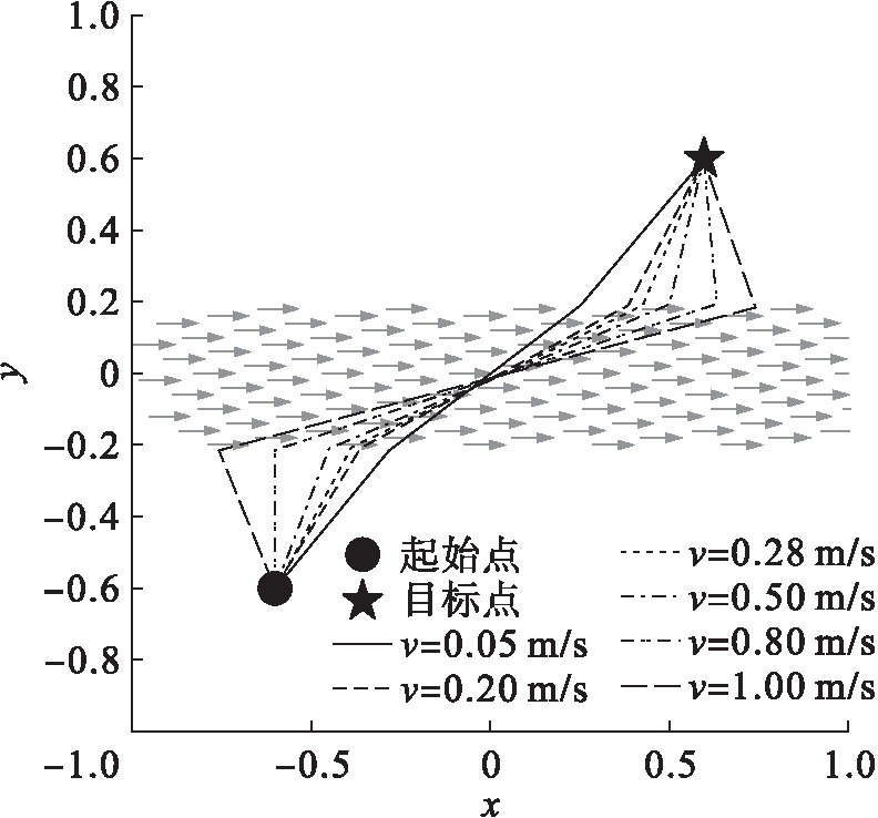 不同速度下机器人的路径规化如图3所示.图3中空间存在着带状速度场,同样结构的外力场中,通过调整速度场的大小进行了6组实验.仿真结果表明,路径规划算法可以有效利用外力来加快自己的运动,并且在强流场中算法仍能保持原有的精度.在较小的速度场中,穿过速度场的路径与x轴的夹角较大,表示机器人可以更容易地穿越速度场;在较大的速度场中,该角度变小,表示在较大的速度场中,机器人可以移动的范围变小,同时算法可以精准地确定进入速度场的位置,以确定在较强的外力作用下所规划出的路径仍然保持可行性.