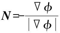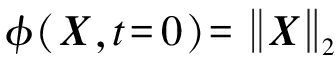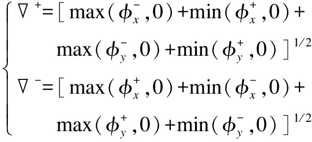 对于∂ω上的所有点Xi均有φ(Xi)=0,选取这种“符号距离函数”作为“高维曲面”存在诸多好处.首先它是光滑曲线,可以避免等高线上出现很陡的梯度,便于后面的计算使用.φ(X)是和时间相关的,所以可被写作φ(X,t),又因为其包含封闭曲线C,所以也可写作φ(C(t),t),简写为φ.