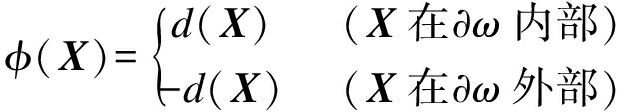 高维曲面φ选取应该是越简单越好,如果该曲面和某一简单的函数之间为一一对应的关系,则选取这种简单的函数来替代“高维曲面”.在水平集问题中,φ通常被选取为“符号距离函数”.假设要跟踪曲线(即零水平集)为∂ω,距离函数d(X)为曲线外围或内部某点到曲线的最短距离,在计算机计算过程中,∂ω本身是由一系列的离散点组成的,所以d(X)的数学表述为d(X)=min|X-Xi|,其中,Xi为组成∂ω的所有点.符号距离函数定义为