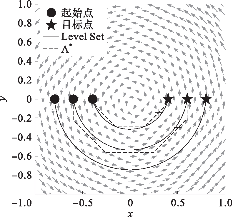 弯曲封闭的外力场在自然界中也很常见,如大气和海洋中存在的涡旋.图4是模拟涡旋生成的一种弯曲外力场,模拟场为同心圆结构,距圆心越远,速度越大.圆心处速度最小,为0 m/s,边界处最大,为1 m/s.仿真选取了3组起始点和终点作为比较,同时以虚线给出了A*算法得到的路径结果.结果显示,在弯曲外力场下,路径可以有效利用外力场,并且生成的路径突破了传统的节点取点方式,形成了连续光滑的曲线路径.A*路径由于必须在网格点上取点,因此要牺牲一些距离来取网格点.从时间上来看,Level Set路径完成后,A*路径还没有到达终点,图4中以“×”表示与Level Set相同时间的A*所能到达的点.