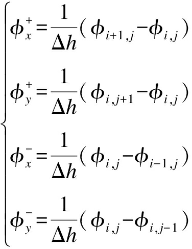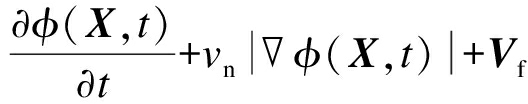 通过式(13)的演化机制,水平集函数可以不断向前演化.由于数值计算中使用了有限差分法,因此需要注意时间步长Δt的选择,在给定空间网格间距Δh的条件下,需满足