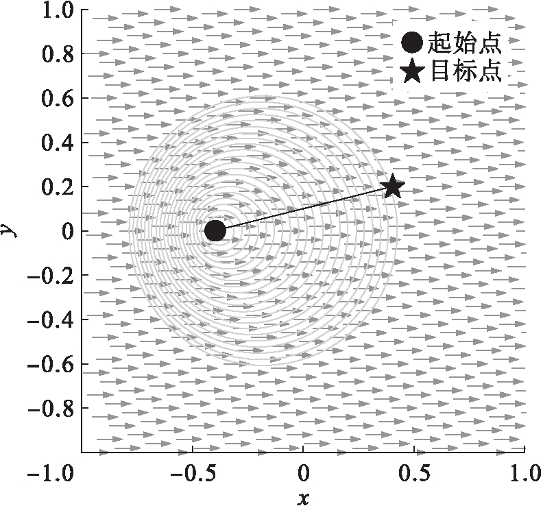 在有向外力作用下机器人路径规划问题的仿真实验中,配置空间规约在二维平面上,空间的两个坐标轴x、y都在[-1,1]之间.为进行数值计算,x和y方向上被均分成m×n个网格,分别按i和j来索引.空间内的外力速度场Vf在这些网格上取值,其中第(i,j)个网格点上的外力速度为Vf(i,j).在以下的仿真实验中,机器人的速度保持恒定,在仿真中设定为vn=0.28 m/s.