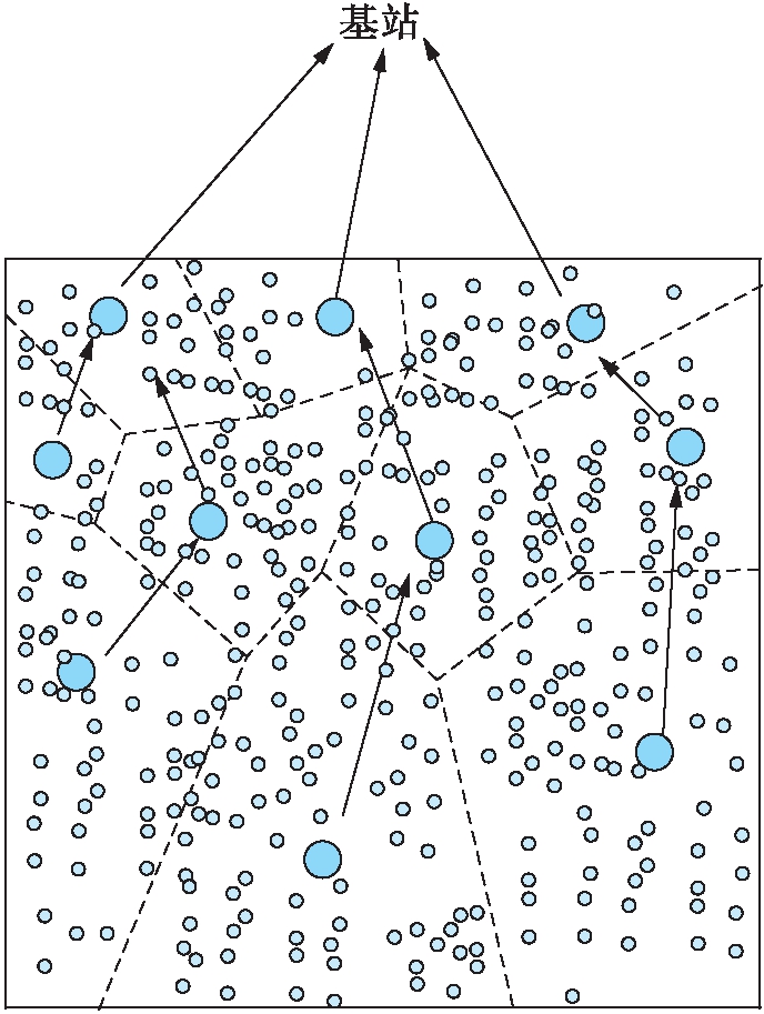 早期的WSNs多采用均匀分簇的分层路由,即以某种标准将网络划分为规模均等的簇.LEACH[2]是无线传感器网络最早的分簇路由,该协议随机选取簇头,非簇头节点将数据传送到簇头,簇头进行数据融合后发送到基站.LEACH减少了与基站直接通信的节点数和数据量,且采用了簇头轮换机制,有较好的节能效果.TEEN[3]对LEACH做了改进,通过设置广播硬门限值和软门限值降低了不必要的数据传输次数,使数据传输更加高效.PEGASIS[4]在LEACH的基础上加入了链式结构,即各节点均从邻居接收数据,并向另一邻居发送数据,最终发送给基站.PEGASIS的通信只限于邻居节点,每轮只随机选取一个簇头与基站通信,大大减少了通信量.