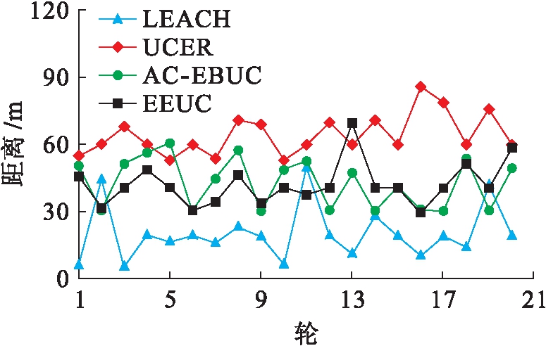 图5为几种协议所产生的簇头间距变化.可以看出,LEACH中簇头间距平均约为20 m,EEUC约为40 m,本文协议UCER约为65 m.该指标直接受成簇数量的影响,在固定区域内,成簇量过多,则直接导致簇头间距过小,LEACH可能导致在局部区域内簇头过于密集,而其他区域簇头过于稀少,直接导致簇内数据通信产生更大的开销.而UCER通过在层次内部设置竞争半径使得各簇头不在相互竞争半径内,簇头分布更加均匀.