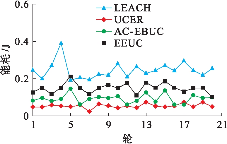 图6为协议的簇头能耗变化.簇头能耗的变化取决于协议在簇间是单跳还是多跳方式.由于LEACH与基站的数据通信是单跳方式,簇头能耗最大,因为长距离通信占据能耗主要部分.EEUC和UCER采用簇间多跳方式路由,但EEUC每一轮的簇头选择是在全网范围内进行广播竞争,消耗了更多的能耗.UCER则在层次内进行广播簇头选择,节省了部分数据通信能耗.同时,由于文中假设簇头上的数据融合能耗是固定的,所以这部分能耗不会因单跳或多跳通信方式产生很大变化.