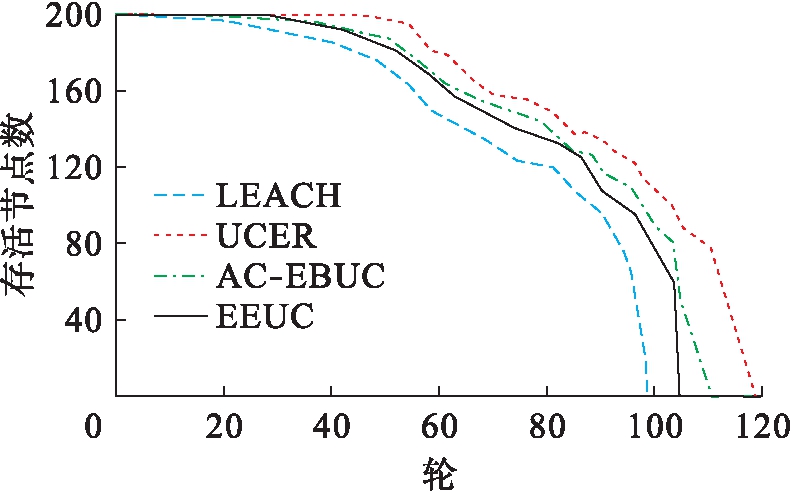 图8为网络的生存时间,以传感器节点是否存活情况表示.可以看出,LEACH最早出现节点死亡情况,UCER则到40轮才出现第一个节点死亡.主要原因是新协议在选择簇头时考虑了节点的剩余能量和各层次的平均剩余能量,且根据距离基站的远近划分将节点组织成不均匀大小的簇规模,并采用多跳的簇间路由方式,为节点节省了能耗.EEUC出现节点死亡和最后一个节点死亡均早于UCER,这是由于UCER中提出的计时广播方式能有效减少簇头竞争阶段产生的通信能耗,而EEUC的全局协商簇头选择机制相对而言会消耗更多能耗,且UCER层次内的簇头选择机制为节点进一步节省了能耗,其网络生存时间更长.