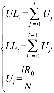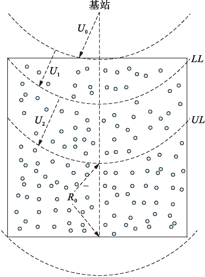设矩形观测区域中的网络以基站BS为中心划分为N个扇形区域,扇形区域的上边界表示为UL,下边界表示为LL,最远层次表示的非规则区域间距(上边界与矩形下边)设置为R0,该层次为不规则区域.计算层次UL边和LL边与BS间的距离,然后将该距离通过Hello广播至全网,广播消息格式为:网络层数,UL边与BS间距,LL边与BS间距.同时,在部署阶段,节点根据Hello广播信号强度计算与BS的间距,同时节点通过该距离计算出自己所属的层数i,其计算公式为