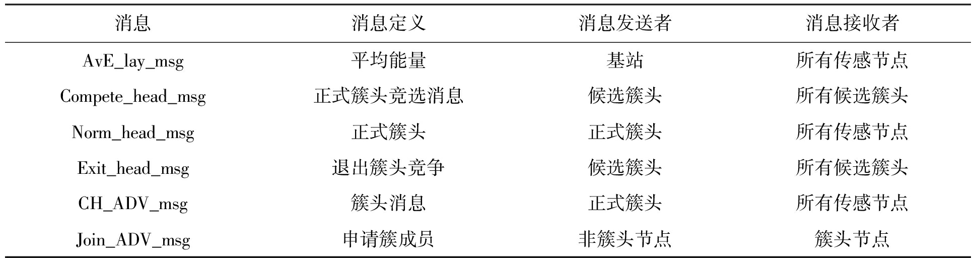 消息消息定义消息发送者消息接收者AvE_lay_msg平均能量基站所有传感节点Compete_head_msg正式簇头竞选消息候选簇头所有候选簇头Norm_head_msg正式簇头正式簇头所有传感节点Exit_head_msg退出簇头竞争候选簇头所有候选簇头CH_ADV_msg簇头消息正式簇头所有传感节点Join_ADV_msg申请簇成员非簇头节点簇头节点
