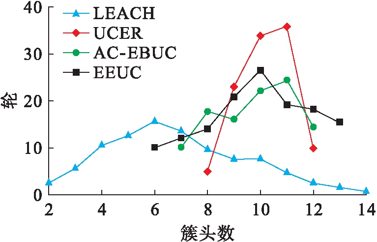 图4为新协议的成簇个数分布.LEACH的成簇量分布范围最大,而EEUC和UCER相比较更为集中,主要原因是三种协议在簇头选择上的差异.LEACH的簇头选择由随机数控制,每一轮的成簇量是无法控制的.相比较而言,EEUC和UCER通过竞争方式产生簇头,每一轮产生的成簇量则更为稳定.同时,UCER在层次内以计时广播形式和设置成簇半径方式取代竞争协商,簇头数量更为稳定.