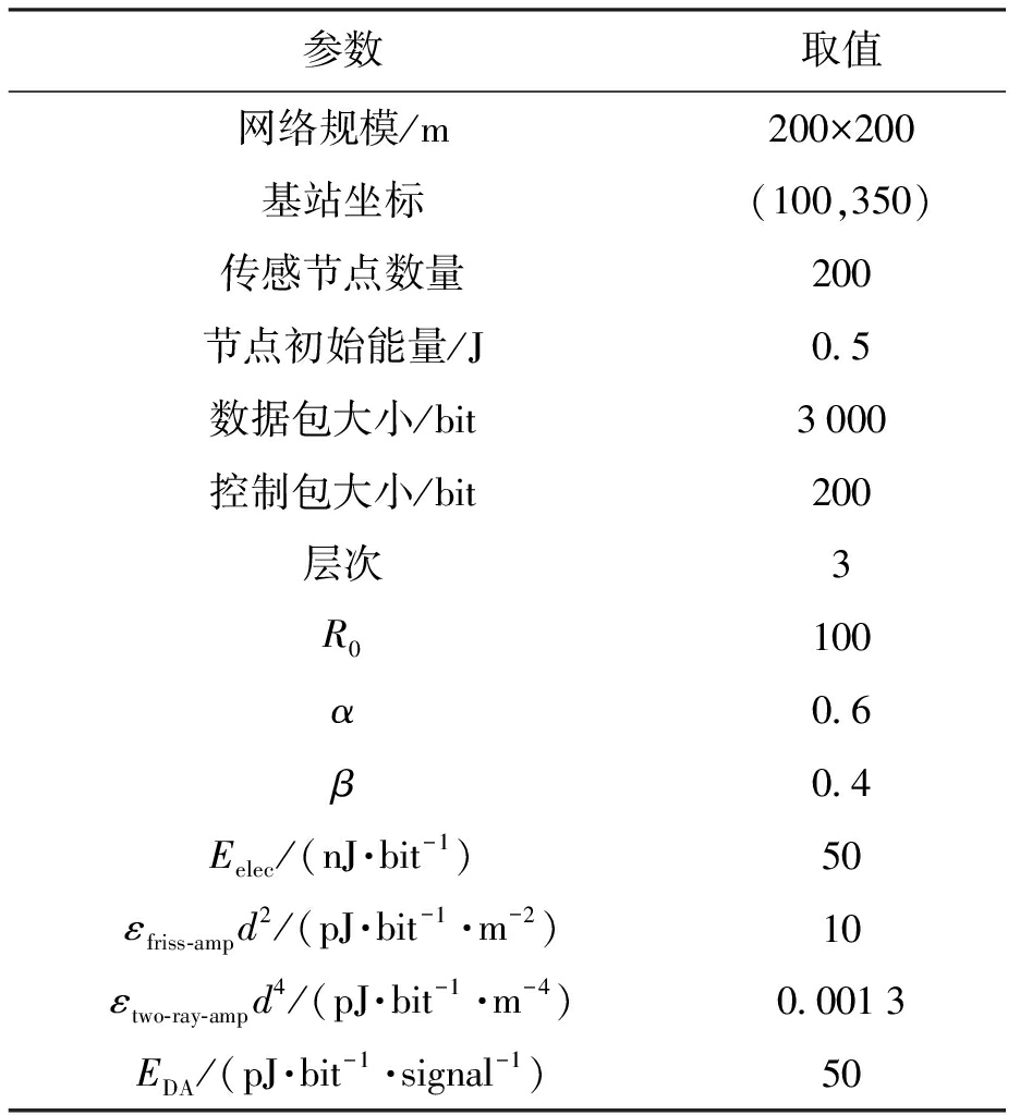参数取值网络规模/m200×200基站坐标(100,350)传感节点数量200节点初始能量/J0.5数据包大小/bit3000控制包大小/bit200层次3R0100α0.6β0.4Eelec/(nJ·bit-1)50εfriss-ampd2/(pJ·bit-1·m-2)10εtwo-ray-ampd4/(pJ·bit-1·m-4)0.0013EDA/(pJ·bit-1·signal-1)50
