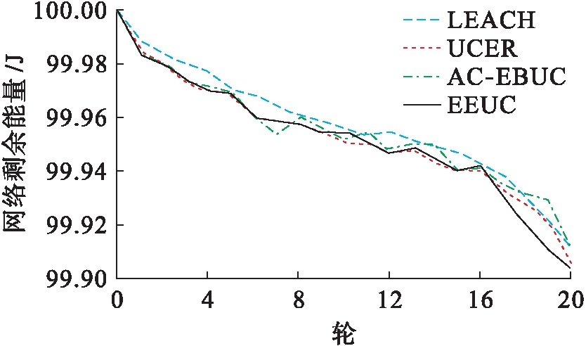 图7为几种协议的成簇能耗,表现为网络的总剩余能量.由于EEUC和UCER在成簇阶段加入了簇头竞争机制,候选节点需要在局部范围内进行簇头竞选,此时需要广播竞选消息,但由于该消息报文容量极小,所以相较LEACH而言,会带来一部分能耗.LEACH成簇是随机的,没有节点间的簇头竞争,因此网络剩余能量更多.总体来说,尽管成簇能耗变大,但所占比例较小,通过簇头竞争的非均匀分簇路由效率仍是更好的.